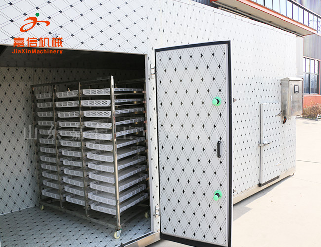 首先將脫青皮8小時后的核桃推入烘房,溫度控制在高達30-35℃烘12小時個,過程中注意排濕,果殼表面水分散失,顏色由黑褐轉(zhuǎn)為褐色時排濕結(jié)束。 此后升溫到 45-50℃烘烤12小時特,征為敲開核果后果內(nèi)無水汽,仁已定色,七成干。后溫度控制在30℃,約16個小時即可,含水量達10%左右。堅果相互碰撞時,聲音脆響,橫隔膜易折斷,核仁酥脆。在常溫下,相對濕度60%的堅果平均含水量為8%,核仁約4%,便達到干燥指標。